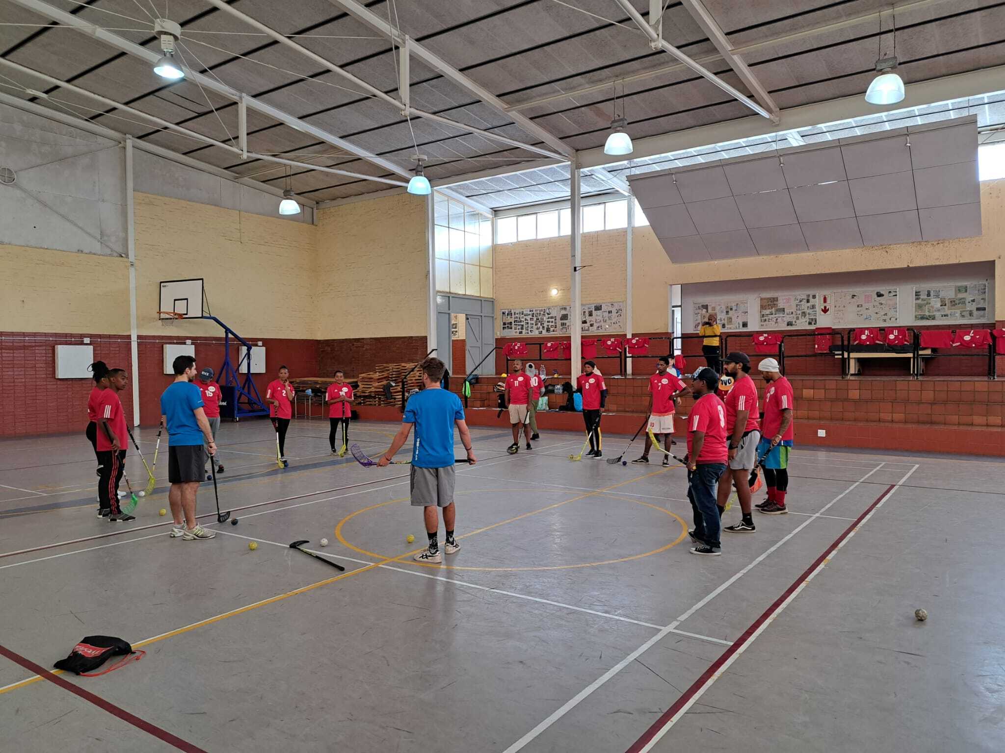 Am Dienstag war dann früh “tagwach“, da noch einiges für den Trainerkurs vorbereitet werden musste. Bereits um 08:00 Uhr war Treffpunkt und Kickoff in der erstaunlich grossen Sporthalle von Ocean View. Etwa 20 Teilnehmende sind am Trainerkurs vertreten, etwa die Hälfte davon bereits zum zweiten Mal nach 2021. Nach einer kurzen Vorstellungsrunde legten wir gleich los mir verschiedenen Übungen. Wir waren beeindruckt, wie gut bereits gespielt wurde und wie motiviert die Teilnehmenden waren. Ebenfalls haben wir uns Zeit genommen, um von den Teilnehmenden zu hören, was seit dem letzten Einsatz im Jahr 2021 alles so gegangen ist. Uns wurde erzählt, wie viele Kids mit grosser Freude an den Kursen teilnehmen und die Trainer:innen in ihren jeweiligen Regionen wahrgenommen werden. Ein Coach erzählte beispielsweise, wie er durch Unihockey persönlich gewachsen sei und dass er vorher in seiner Umgebung beinahe unbekannt war, und ihn nun alle von weit her freudig mit „Mr. Floorball“ begrüssen, wenn er vorbeigeht. Nach diesem ermutigenden Austausch ging es weiter mit Übungen auf dem Spielfeld. Zwischen den Übungen blieb auch immer etwas Zeit, um einander kennenzulernen, wobei der südafrikanische Township-Slang doch oft ziemlich viel Konzentration benötigt, um etwas zu verstehen. Nach etwa acht Stunden in der Halle haben wir den ersten Kurstag erfolgreich beendet und sind nun sehr gespannt auf die nächsten Tage.